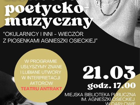 W naszej bibliotece im. Agnieszki Osieckiej w Darłowie aktorki i aktorzy Teatru Antrakt ożywią wybrane piosenki poetki w swoich autorskich interpretacjach. Muzyka przeplatać się będzie ze słowem, ciekawostkami i anegdotami.