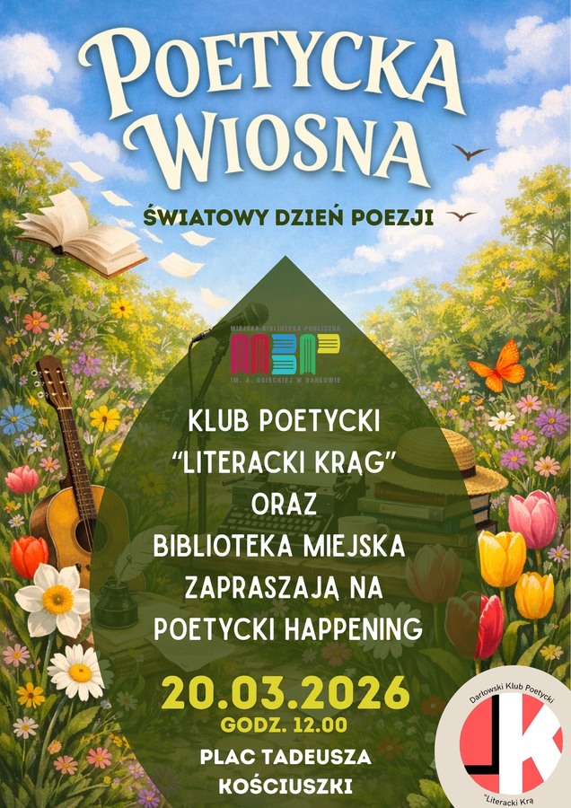 Darłowski Klub Poetycki „Literacki Krąg” oraz Miejska Biblioteka Publiczna im. Agnieszki Osieckiej w Darłowie zapraszają na poetycki happening z okazji Światowego Dnia Poezji.